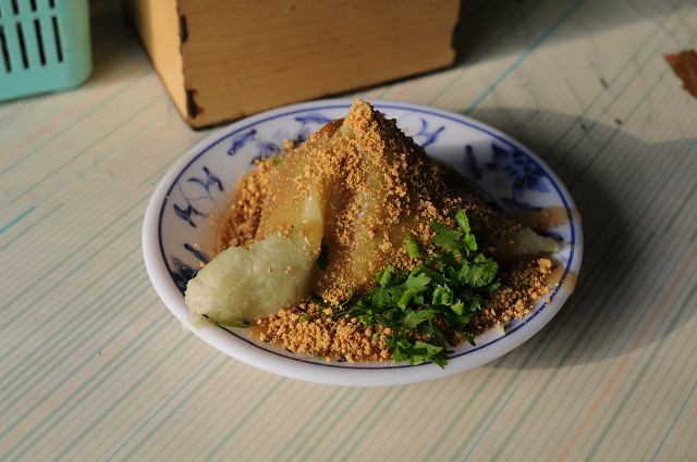 菜粽的材料很單純,只有花生跟糯米,月桃葉裹出它的香氣,和著花生粉及獨